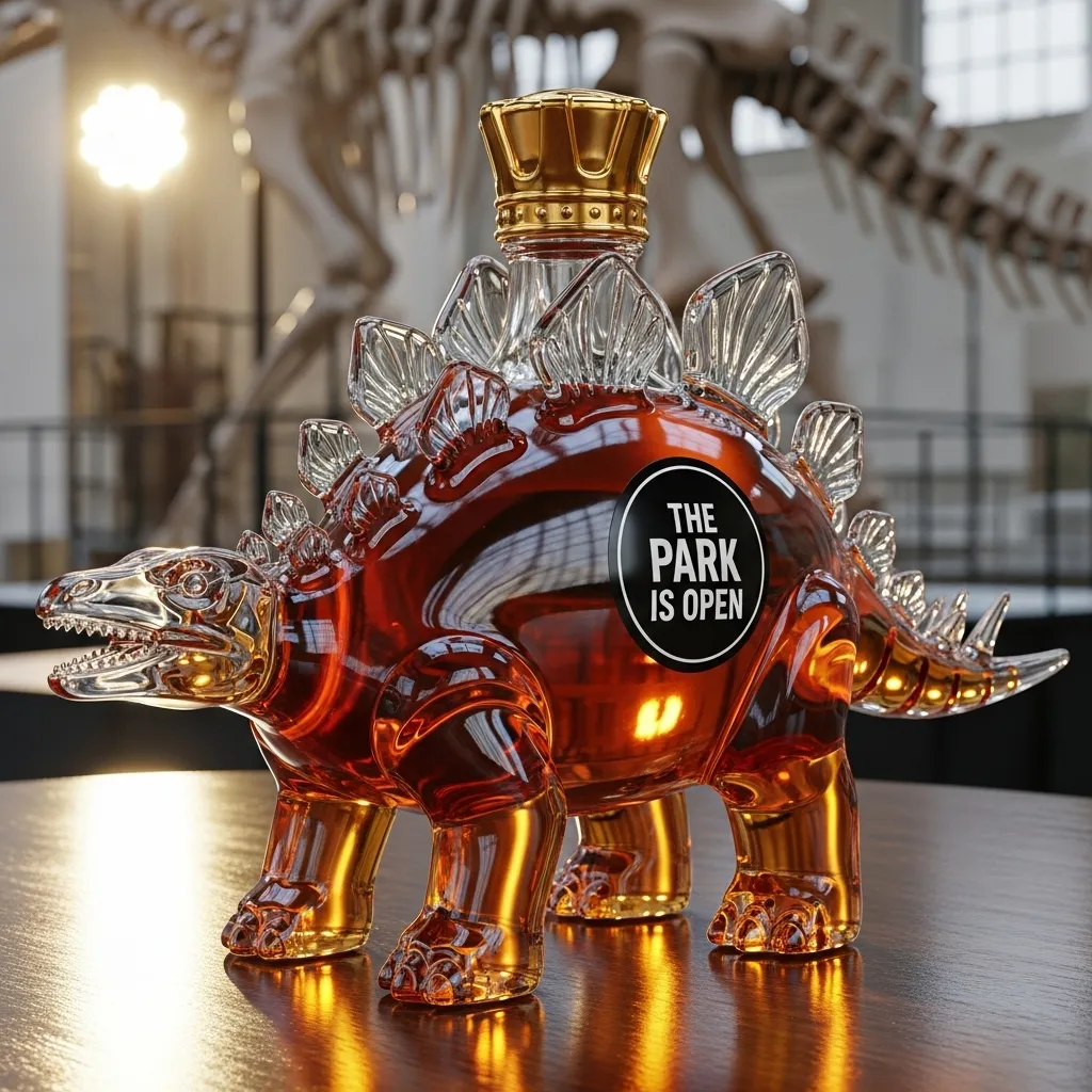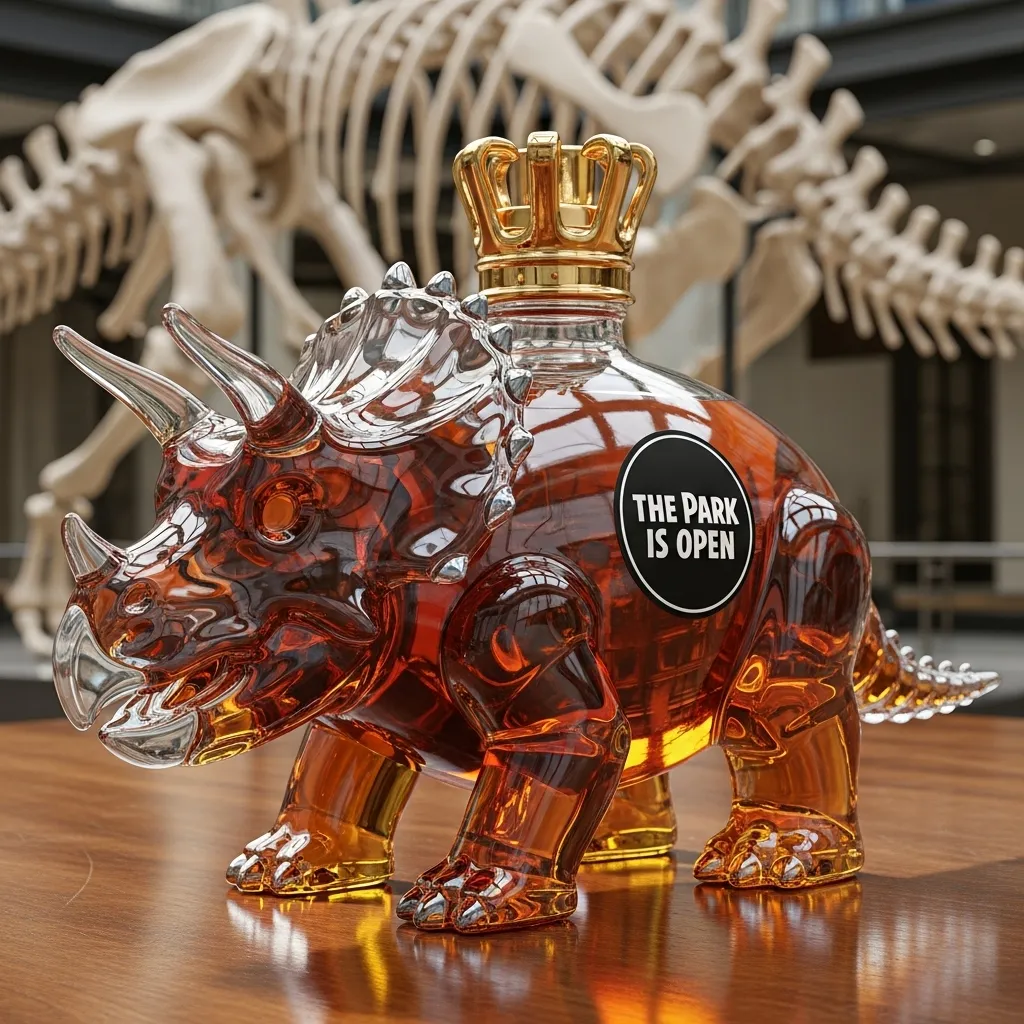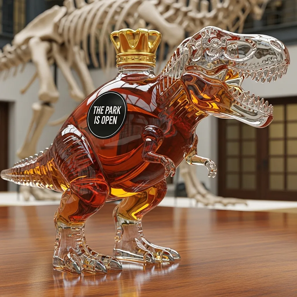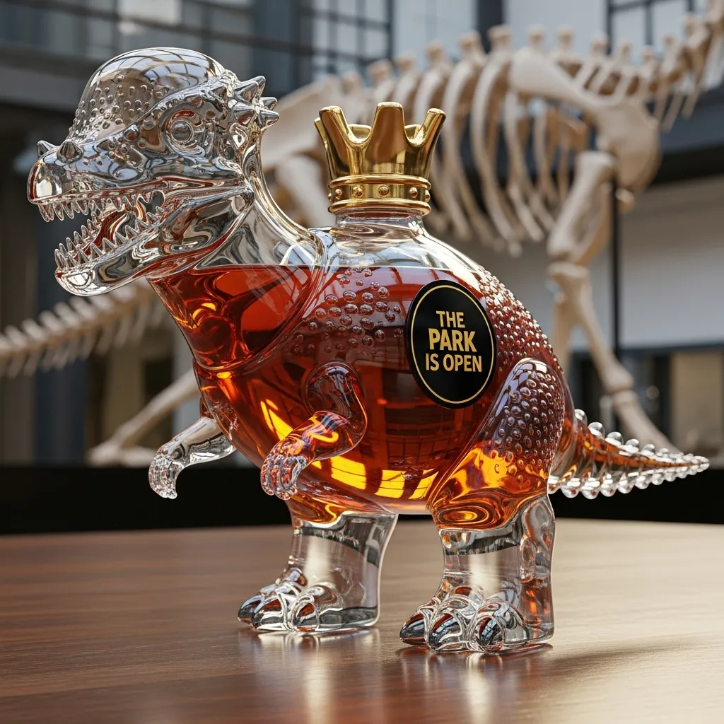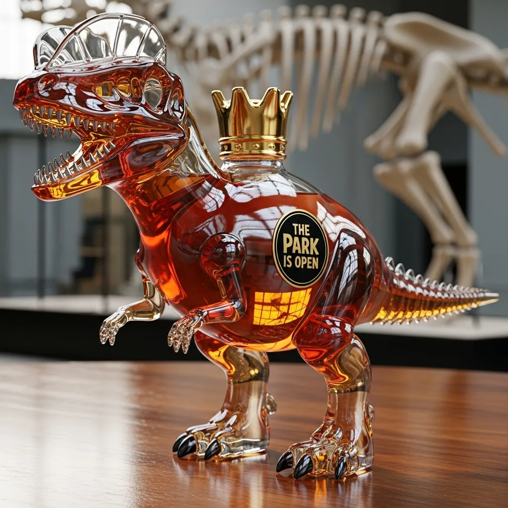 Inspired by prehistoric behemoths, this bottle is hand-blown from premium glass, showcasing exquisite craftsmanship in every detail. The transparent bottle contrasts beautifully with the amber-colored liquid, instantly transporting you back to the thrilling and adventurous age of dinosaurs.