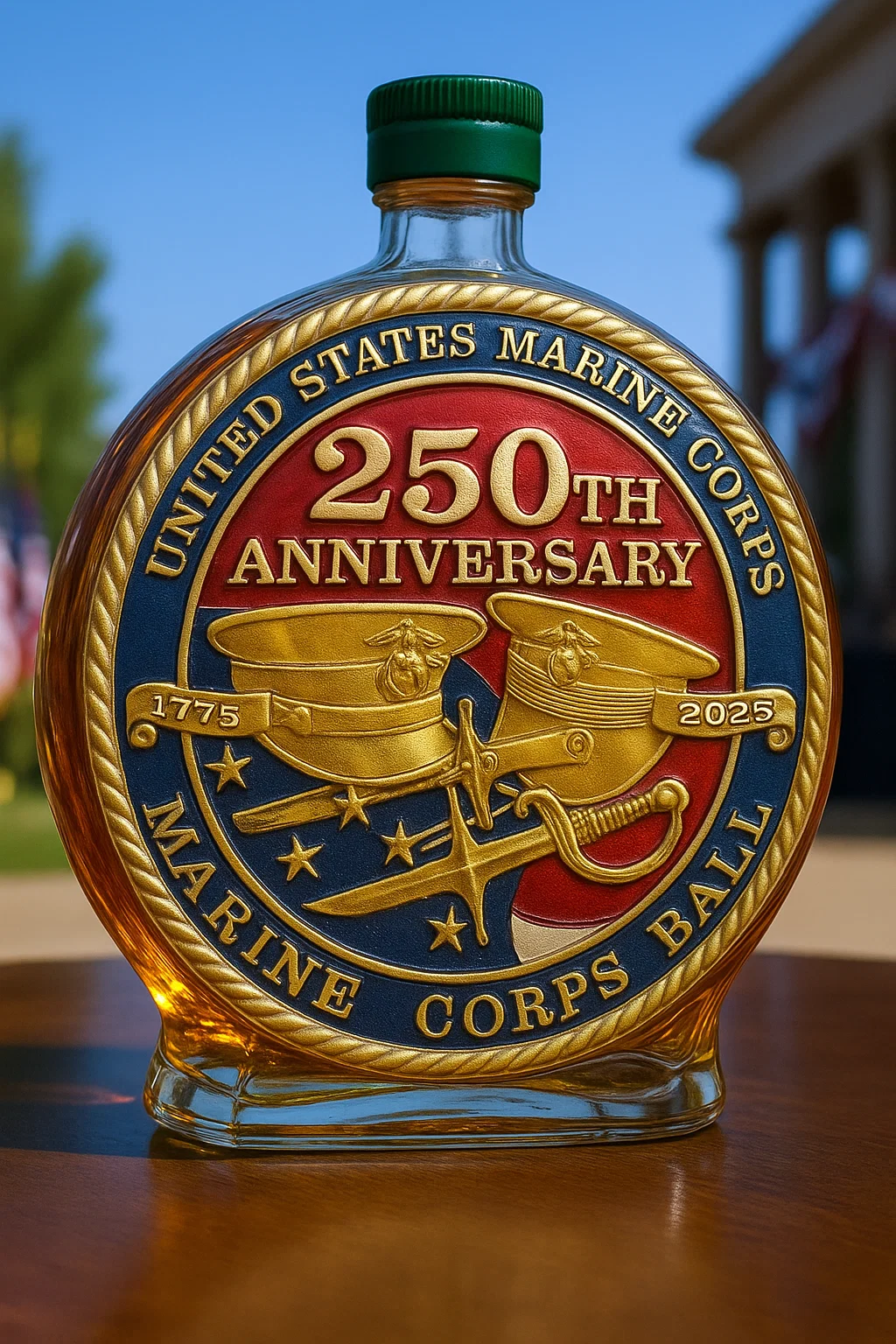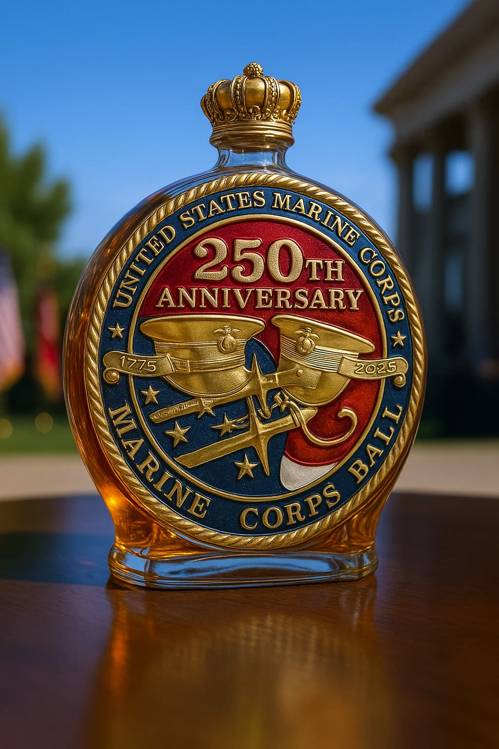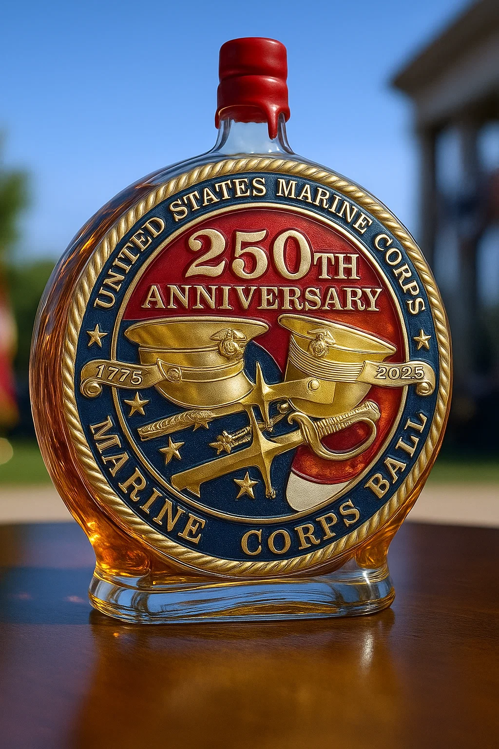 The decanter itself is a work of art, featuring a beautifully detailed, three-dimensional medallion that commands attention. Set against a deep red, textured background, the words “250TH ANNIVERSARY” are proudly displayed in bold gold lettering. This is encircled by a rich blue border featuring the text “UNITED STATES MARINE CORPS” and “MARINE CORPS BALL.” The centerpiece of the emblem showcases two historic Marine Corps service caps and the iconic Mameluke sword, flanked by the historic dates 1775 and 2025. The entire bottle is crafted from high-quality, clear glass, allowing the rich color of your chosen whiskey to shine through.