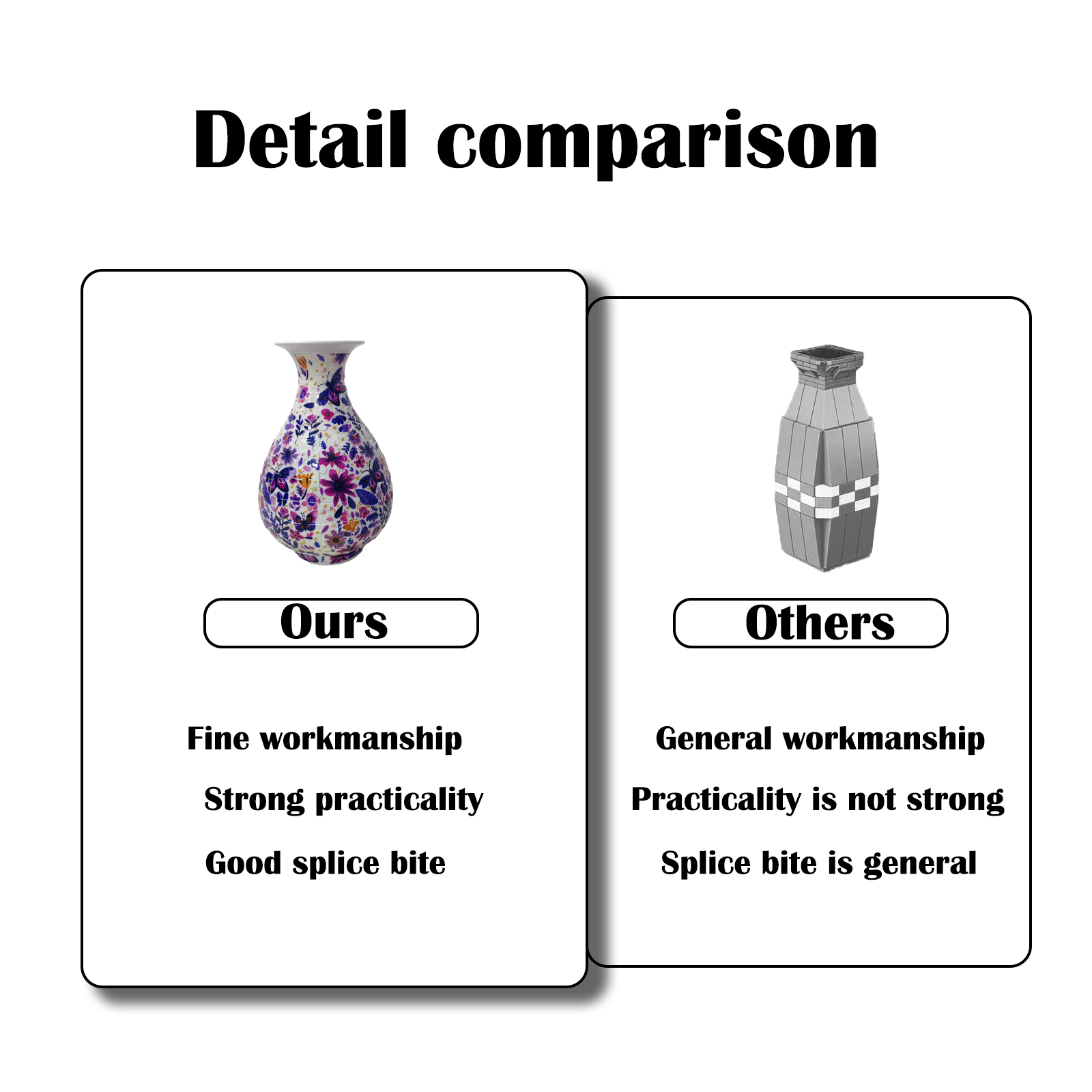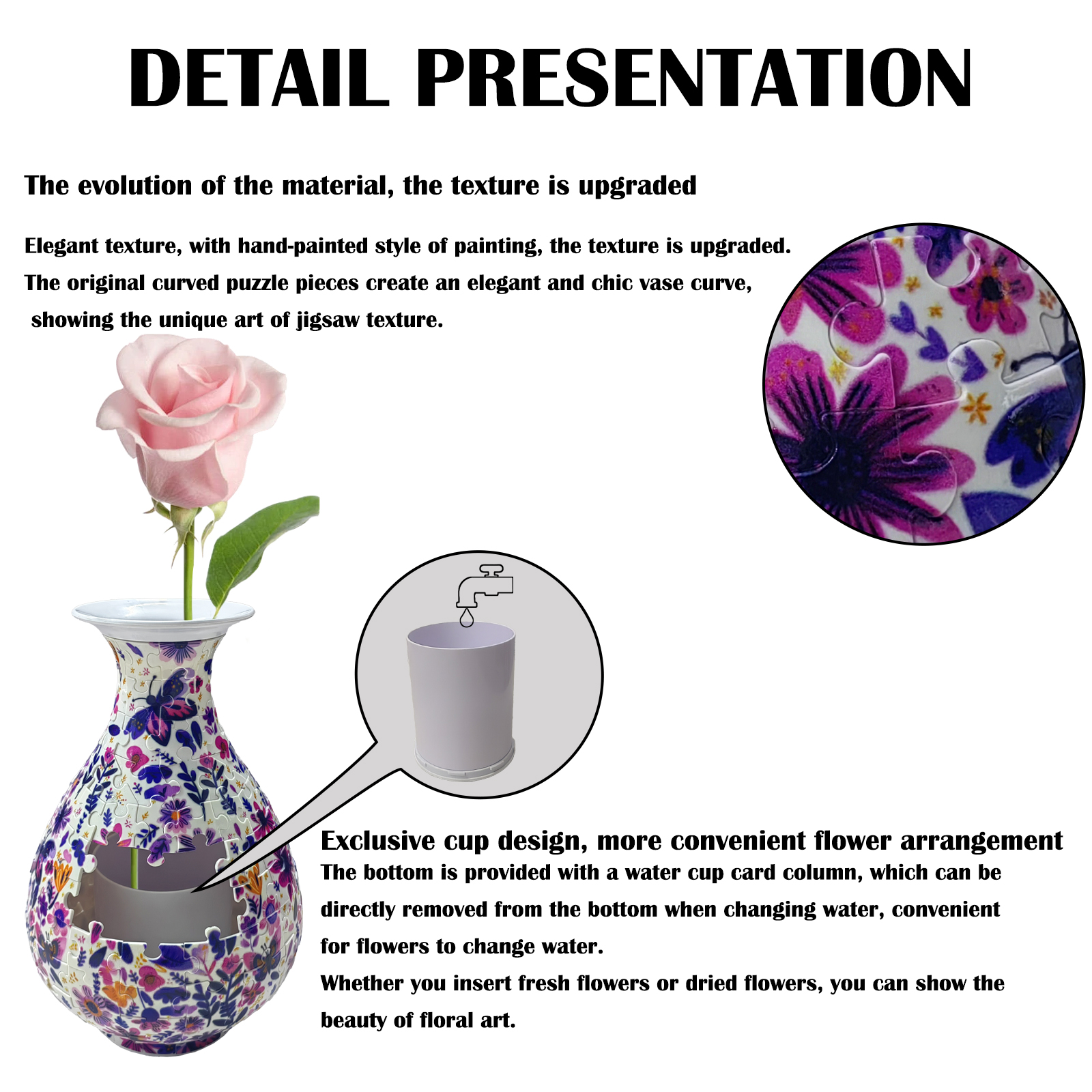 This 3D puzzle vase is designed with 162 curved pieces that interlockseamlessly. creating a sturdy and durable structure without the need forglue.Once assembled. it stays firmly in place. thanks to its precision-cutdesign.The included detachable water cup fits snugly inside. making itsafe and practical for real flower arrangements.
